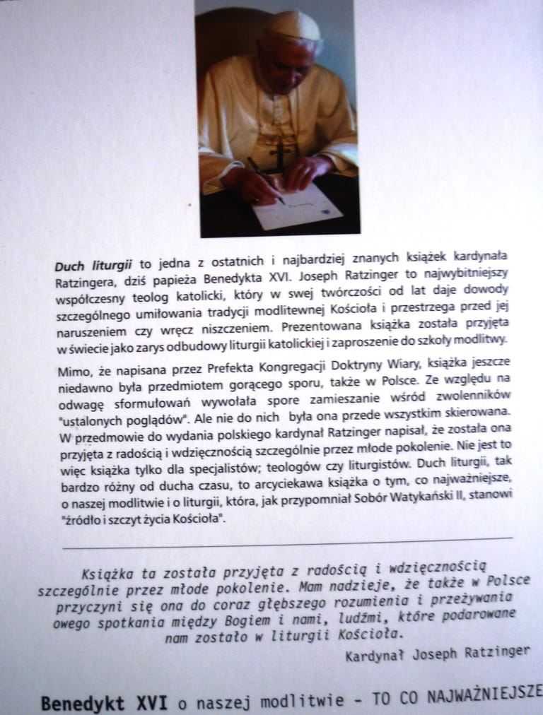 Duch liturgii, tak bardzo różny od ducha czasu, to książka o tym, co najważniejsze, o naszej modlitwie i o liturgii, która, jak przypomniał Sobór Watykański II, stanowi "źródło i szczyt życia Kościoła" (z okładki).